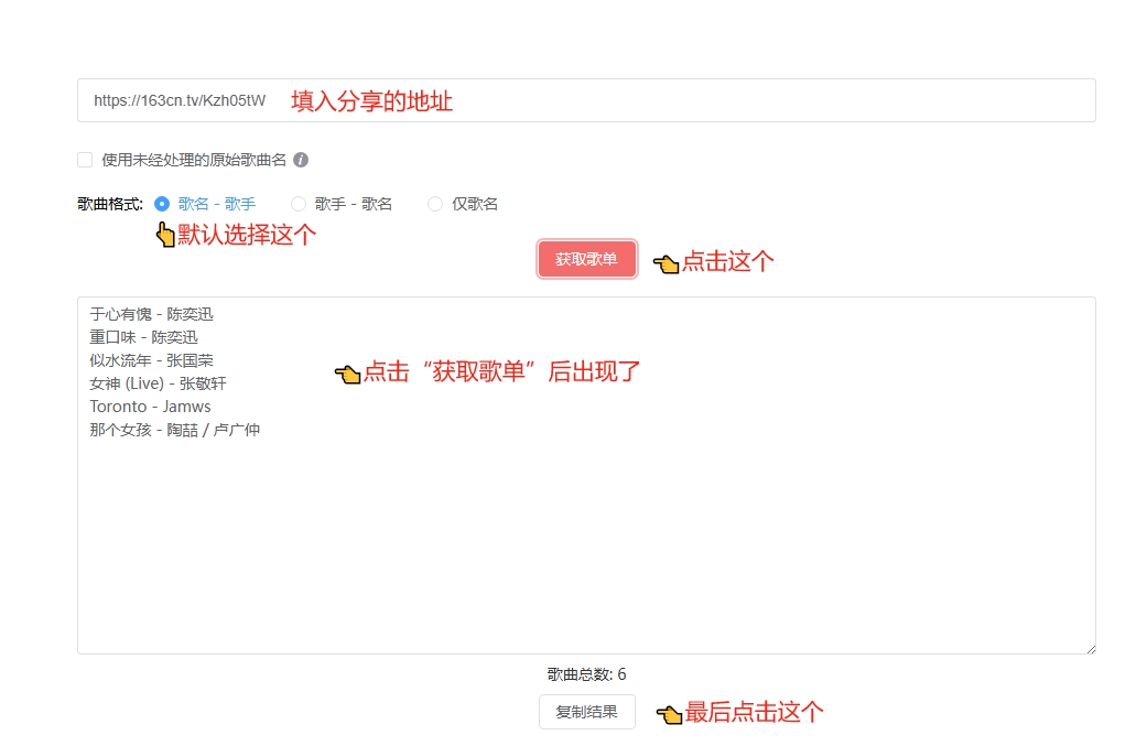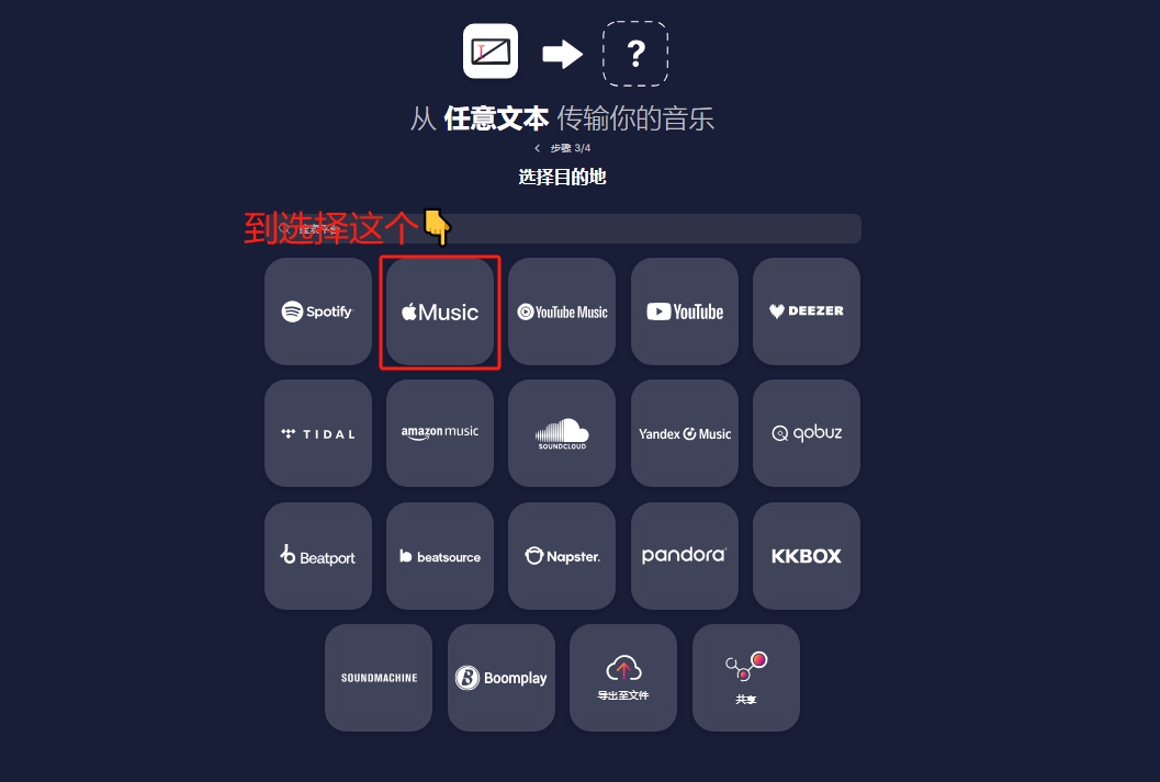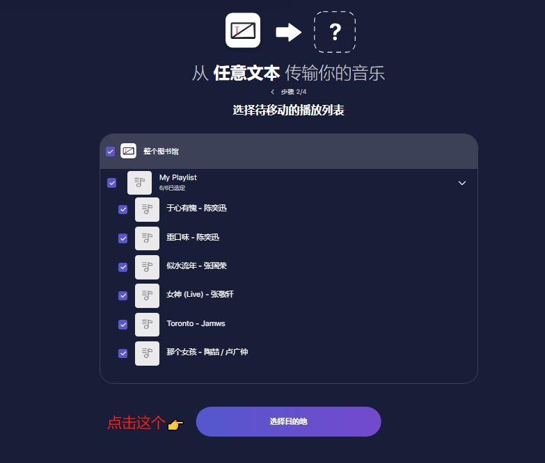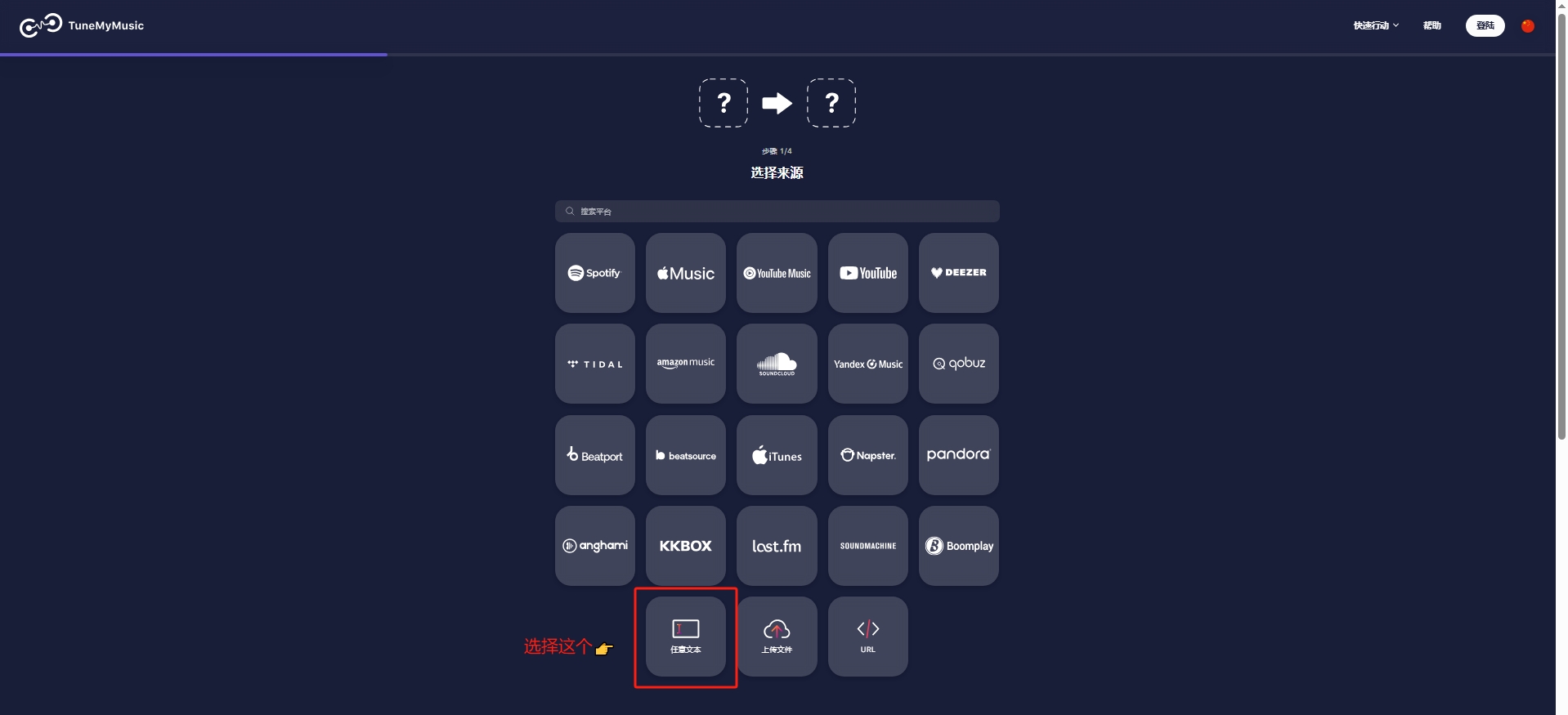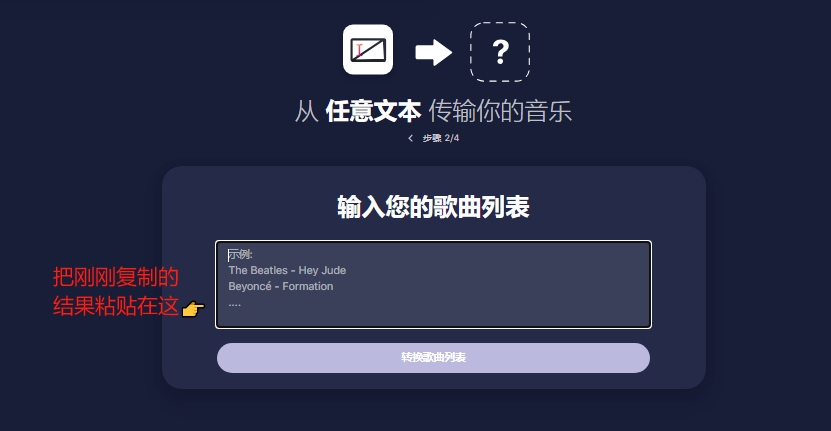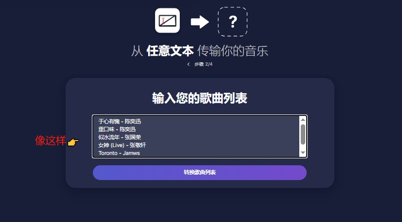 复制刚刚获取到的歌单结果后,打开这个https://www.tunemymusic.com/zh-CN/transfer ,后面全程按照我的照片教程来,基本都ok了!